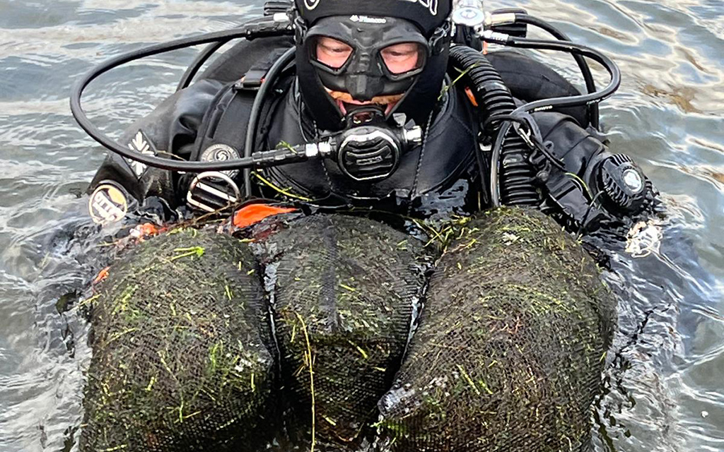 Following a smaller pilot earlier in the year, BSAC divers came together on 30 December for a full day’s clearing, removing 50 bags of invasive weed.